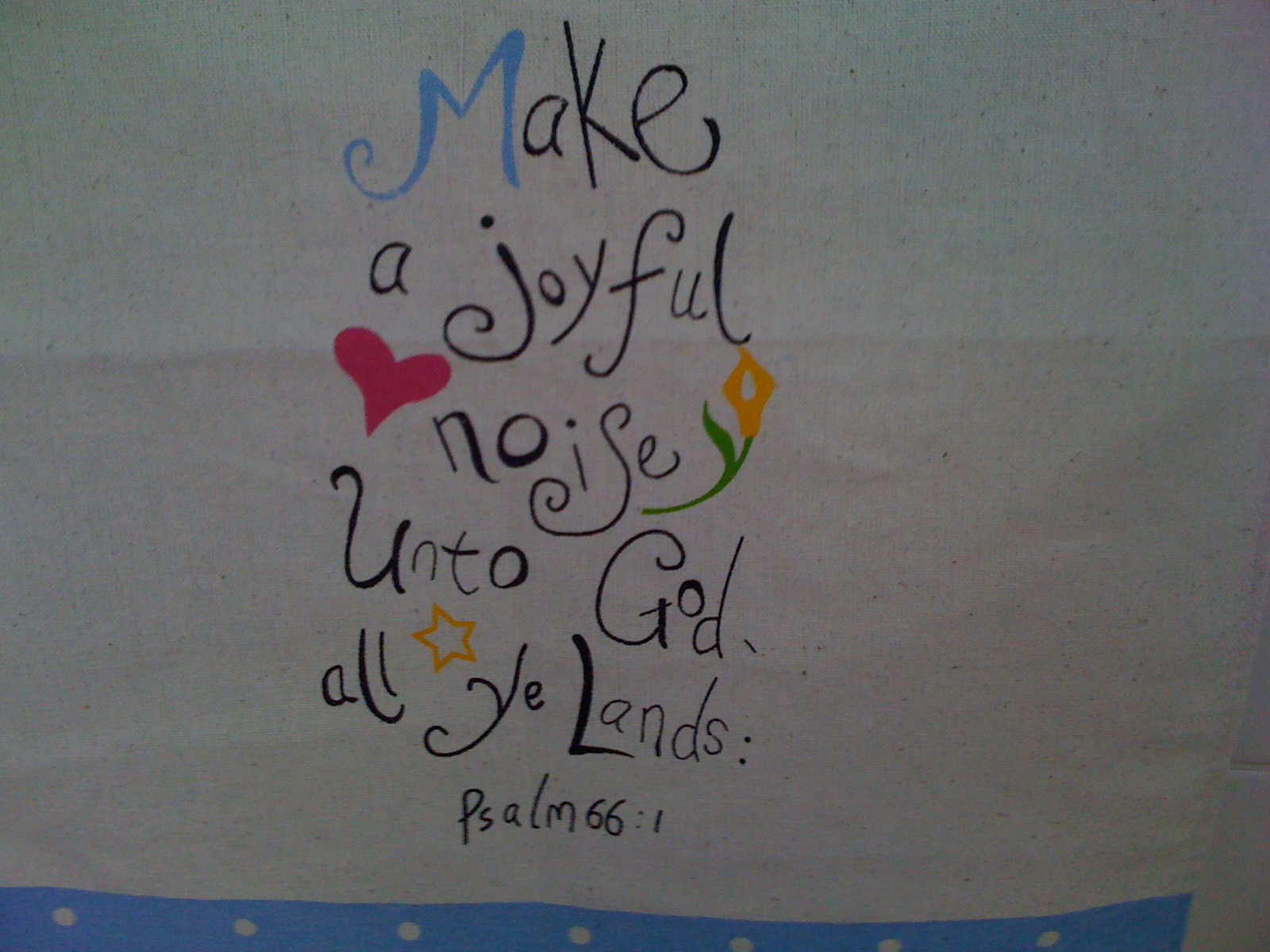 The image that accompanies this post (the text says “Make a joyful noise unto God, all ye lands.”) is a photo of the sampler my sister Elle had hanging in her bathroom next to the toilet.